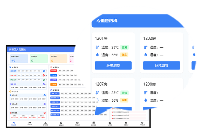 監(jiān)測(cè)病房溫度、濕度,顯示環(huán)境狀態(tài),并可進(jìn)行環(huán)境調(diào)節(jié),營造舒適就醫(yī)環(huán)境。